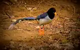 The blue magpies are, as may be judged from their handsome tails, essentially arboreal birds; though, while they are most usually to be met with in heavy jungle areas, they also venture out into the trees amongst cultivation, and at times on to bare mountain sides at high elevations. They frequently feed on the ground and then adopt a curious hopping gait, with the tail held high to prevent it coming into contact with the ground. They live in parties of seven or eight birds and are very partial to particular localities, so that once a party has taken up its abode in any particular nullah or patch of forest it will generally be found there. They are very active, flying incessantly from bough to bough and not hesitating to launch high into the air when flying from ridge to ridge; a party of these bird crossing a nullah out of gunshot above one's head is a curious sight, with their long tails waving in the air and the light shining through the feathers. The flight is rather slow, laboured, and undulating once the bird comes into the open. The food consists of small mammals, the eggs and young of other birds, insects, and wild fruits and berries of various kinds. This bird is very noisy; the ordinary call is harsh and grating, but it has a wide variety of notes, some of which are melodious enough.