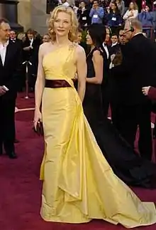 Australian actress Cate Blanchett wore a pale yellow silk taffeta Valentino dress to the 77th Academy Awards on 26 February 2005. It was the dress Blanchett wore when she won the Academy Award for Best Supporting Actress for her performance in The Aviator in front of some 42.1 million people on American television.[1][2] Cosmopolitan has cited the gown as one of the Best Oscar dresses of all time, stating, "In this yellow silk taffeta gown created especially for her by Valentino, Cate looks like a classic Hollywood starlet. The one-shoulder strap and contrasting belt are great details, and the color is perfect for her milk-white skin."[3]
