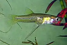 Girardinus falcatus, the goldbelly topminnow,[1] is a species of Cuban tropical fish. Another common name of the species is yellow belly. The fish is pale gold and has a bright blue iris. Males are smaller than females and constantly mate.[2]
