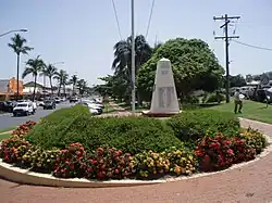 The Yeppoon War Memorial is situated over three streets and a park in Yeppoon, all located in the central section of the town. The beach foreshore and esplanade, Anzac Parade has a row of mature hoop pines (Araucaria cunninghamii) evenly spaced by approximately two metres. This row extends around the corner into Normanby Street, with four mature hoop pines centre planted into a specially created tree reserve. The avenue continues in Normanby Street between Mary Street and Arthur Street planted in the roadside reserve. A row of Coconut Palm Trees is centre planted in James Street under which small concrete cairns are located. Each cairn carries two brass plaques commemorating an individual serviceman. Two original plaques remain in situ, on a short timber pickets.[1]
