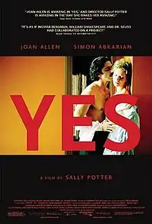 Yes is a 2004 British-American film written and directed by Sally Potter[1] and starring Joan Allen, Simon Abkarian, Samantha Bond, Sam Neill, Shirley Henderson, Raymond Waring, Stephanie Leonidas, and Sheila Hancock.