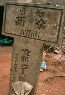 The township sign of Xinzhai village, Yiwu, in Dai and Chinese scripts. (November 2004)