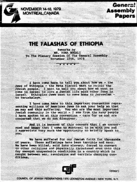 In 1979, increasingly pressured by the Derg, the military coalition that had replaced the King, Bogale emigrated to Israel with help from the American Association for Ethiopian Jews and his own relatives. Later that same year, Bogale, his son, Zecarias Yona, Rahamim Elazar and Baruch Tegegne traveled to Montreal, Canada, at the invitation of the Council of the Jewish Federations, to address that organization's General Assembly.[3] On November 19, Bogale spoke during the plenary session to the 2,500 North American Jewish leaders in attendance. Following his presentation, delegates passed a pro-Beta Israel resolution, becoming the first major Jewish organization to support saving the Ethiopian Jewish community.[5]