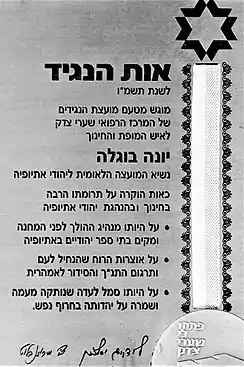 Because of his devotion to his people and his persistence in freeing them from oppression, Bogale has often been compared to Mahatma Gandhi, Nelson Mandela, Martin Luther King Jr. and Theodor Herzl.[1][2] In addition to his life's work of returning the Beta Israelis to their homeland in Israel, he was a prolific author, editor and translator. Among other works, he published A "Falasha" Book of Jewish Festivals, an Amharic translation of portions of Pirke Avot and other prayer books, a Hebrew-Amharic dictionary, and translations of two 16th Century history books—all intended to give those Ethiopian Jews who were not proficient in Hebrew access to books in their native tongue, as well as the means to learn the language of their religion. Fluent in Hebrew, Yiddish, English, French, Italian, German, Tigrinya, Oromia, Geez and Amharic languages,[6] he introduced the Beta Israel community to the first Hebrew-English-Amharic calendar, published every year from 1954 to 1978.[7] Bogale was an early proponent of Ethiopian Jews praying in Hebrew instead of the ancient Semitic language, Ge'ez, as he felt that it was no longer appropriate for those seeking to be a part of the broader Jewish community. However, he did think that Hebrew prayers could be set to Ethiopian Jewish melodies to preserve some liturgical traditions of the Beta Israel community. Examples of Bogale's work and one of his awards appear below:
