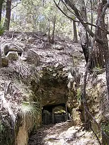 Under the direction and instruction of the Eastern Command and the supervision of the Department of Main Roads, workers from Dumaresq Council, local miners and timber workers began construction of the barrier system with the excavation of the tunnel under the old Armidale-Ebor Road. This system was to comprise an approach trench, main tunnel shaft with two iron and concrete-lined explosive chambers (in a "T" shape, each holding 816 kg (1800 pounds of gelignite)), road-fracture lines (lines under the road surface that were to be packed with small charges of explosives) and funk holes (small built shelters to protect personnel from the explosion should the tunnel be detonated).[2][1]