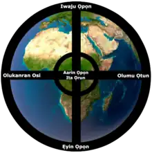 According to Kola Abimbola, the Yorubas have evolved a robust cosmology.[1] Nigerian Professor for Traditional African religions, Jacob K. Olupona, summarizes that central for the Yoruba religion, and which all beings possess, is known as "Ase", which is "the empowered word that must come to pass," the "life force" and "energy" that regulates all movement and activity in the universe".[4][5][6] Every thought and action of each person or being in Aiyé (the physical realm) interact with the Supreme force, all other living things, including the Earth itself, as well as with Orun (the otherworld), in which gods, spirits and ancestors exist.[2][7][8] The Yoruba religion can be described as a complex form of polytheism, with a Supreme but distant creator force, encompassing the whole universe.[9]