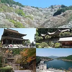 The most well-known area within the town is Yoshino Mountain, famous for its many thousands of sakura trees; much poetry has been written on the subject by several famous authors, including Chiyo and Uejima Onitsura.[1] These flowering cherry trees were planted in four groves at different altitudes, in part so that the trees would be visible coming into bloom at different times in the spring. An account of Yoshino written in about 1714 explained that, on their climb to the top, travelers would be able to enjoy the lower 1,000 cherry trees at the base, the middle 1,000 on the way, the upper 1,000 toward the top, and the 1,000 in the precincts of the inner shrine at the top.[2]