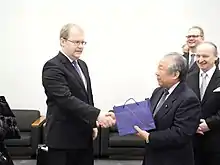 - ↑ "自民参院議員会長に溝手氏" [Mizote elected LDP Councillors' leader]. Nikkei (in Japanese). 30 July 2013. Retrieved 9 February 2016.