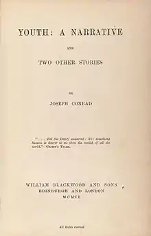 13 November 1902 – the book volume Youth: a Narrative, and Two Other Stories is published by William Blackwood – also contained the stories "Heart of Darkness" and "The End of the Tether"
