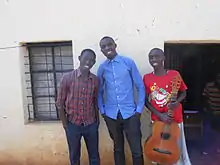 Three Rwandan youth outside of their home.