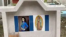 Photograph of Yrma Lydya placed on her tombstone. To one side is an image of the Virgin of Guadalupe (right).