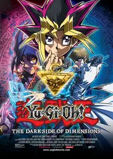 Yu-Gi-Oh! The Dark Side of Dimensions (Japanese: 遊☆戯☆王 THE DARK SIDE OF DIMENSIONS, Hepburn: Yū☆Gi☆Ō Za Dākusaido Obu Dimenshonzu) is a 2016 Japanese animated science fantasy film written and directed by Satoshi Kuwabara, with Kazuki Takahashi and Masahiro Hikokubo as co-writers based on the Yu-Gi-Oh! franchise by Takahashi. Produced by Studio Gallop and distributed by Toei Company, The Dark Side of Dimensions tells a new story that takes place after the events of the original Yu-Gi-Oh storyline; specifically, it is set six months after the end of the original manga, and thus features some slight contradictions to the storyline of the anime adaptation. [lower-alpha 1][2][3] The film stars Shunsuke Kazama as the voice of Yugi Mutou and Kenjiro Tsuda as Seto Kaiba, alongside Hiroki Takahashi, Takayuki Kondo, Maki Satō, Rica Matsumoto, Junko Takeuchi, Kento Hayashi, Kana Hanazawa and Satoshi Hino. The Dark Side of Dimensions was released in Japan on April 23, 2016,[4] in the U.S and Canada on January 27, 2017,[5] and in Australia on February 2, 2017.[6]