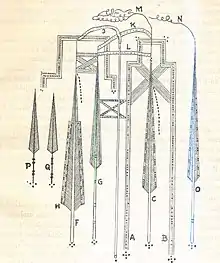 German writer Karl Weule (1915) published a slightly different version of the Shargorodskii's picture, drawn by the artist Paul Lindner, with the caption "Yukaghir Love Letter" in a popular museum booklet.[1] Thus, Weule appears to have been primarily responsible for promoting the idea that the Yukaghir pictures represent love letters.[4] David Diringer's widely-read book The Alphabet (1948) included an illustration, likely based on Weule's work, with the caption "Sad love-story of a Yukaghir girl".[1] According to one interpretation, the arrow shapes represent four adults and two children. The solid and broken lines connecting the arrows represent current and previous relationships between the adults.[5]