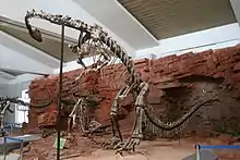The type species, Y. huangi, was named by C. C. Young in 1942, who erected the family Yunnanosauridae to contain it, though the family currently comprises only this genus and sometimes Jingshanosaurus. The specific name honours Huang Chiching ("T.K. Huang"), the director of the National Geological Survey of China.[6] Young also named a second species, Y. robustus, in 1951,[4][7] but this has since been included in the type species.[4] The confusion in classification arose due to that the earliest specimens of Y. huangi were of juvenile individuals while the Y. robustus specimens represented fully grown adults.[4] However, Sekiya et al. (2013) described a juvenile of Y. robustus and were able to differentiate it from Y. huangi. Yunnanosaurus had been assigned to several taxa over the years, including Thecodontosauridae and Plateosauridae, but a more recent phylogenetic analysis conducted by Novas et al. (2011) shows that this genus is part of the taxon Massopoda in a clade with Anchisaurus and Jingshanosaurus.[5] Apaldetti et al. (2011) also found that Yunnanosaurus belonged in Massopoda, but found that this genus was more primitive than both Jingshanosaurus and Anchisaurus.[8]