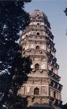 The Yunyan Temple (Chinese: 云岩寺; pinyin: Yúnyán Sì) or Tiger Hill Temple (Chinese: 虎丘寺; pinyin: Hǔqiū sì) was a historical temple located on Tiger Hill in Suzhou, in Jiangsu province, China. The temple was founded in 327 and was last rebuilt in 1871. It has suffered damage in successive wars throughout history, and much of the temple was finally destroyed during the Second Sino-Japanese War, which ended in 1945. The grounds of the temple covered most of what is today Tiger Hill park.