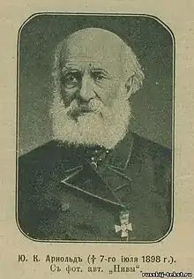 Yuri Karlovich Arnold, also Jury, Georgy, Yourij, and Arnol't, Arnol'd (Russian: Юрий (Георгий) Карлович Арнольд; November 13, 1811 – July 20, 1898), was a Russian composer, musicologist, music critic, choral conductor, theorist and music educator. There is some speculation that he was employed by the tsarist police and that some of the writings attributed to him were actually written by Peshenin, who was paid to keep it a secret. Also that some of his theories on the history of Russian church music are now seen as false. Among his students were Allemanov and Yu Mel’gunov.[1]