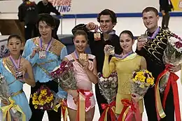 Bazarova/Larionov took silver at the 2007 World Junior Championships. In October, they won their first senior international medal when they claimed the bronze at 2007 Skate America. In December of the same year, the pair won gold at the 2007 Junior Grand Prix Final. However, in January 2008, they were disqualified and stripped of the medal due to a doping violation found in a blood sample Larionov gave before the Final.[5][6][7] Larionov was also suspended for two years, beginning on 18 January 2008.[8] His sentence was later reduced to 18 months and ended on 17 July 2009.[9] Bazarova decided to wait for Larionov: "There were offers from others, but I said right away that I'm not going to skate with someone else."[2]