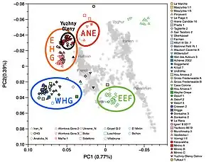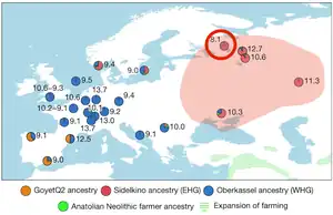 Remains of Eastern Hunter-Gatherers dated to circa 8,100 BP (6,100 BCE) have been excavated at Yuzhny Oleny.[2] A total of 19 Eastern Hunter-Gatherer genomes were extracted from Yuzhny Oleny, which had comparable or lower WHG ancestry compared to other EHG groups.[3] The Ancient North Eurasian (ANE) ancestry is the main component of the Yuzhny Oleny group, and is particularly high among them compared to the rest of the Eastern Hunter-Gatherers (EHG).[4] The 11 ka Sidelkino individual from Samara in western Russia also had a virtually identical profile with the members of the Yuzhniy Oleniy group.[3] The genes of the Yuzhny Oleni were transmitted to the people of the Yamnaya Culture, and to Scandinavia through a western route.[4]
