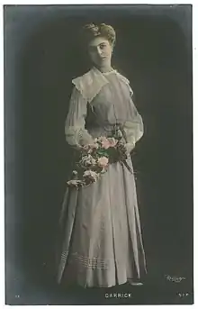 Garrick was a new actress when she appeared in Château Historique in 1900 at the Theatre National de l'Odéon.[5] She played the title role in Psyche, and appeared in Le Mariage de Figaro, Colinette, and La Nuit de Mai,[6] at the Odéon, all in 1901.[7] Garrick appeared in Le Luxe des Autres at the Odéon in 1902.[3]With the Comédie-Française in 1905, she played Jessica in Shylock, ou le Marchand de Venice.[8] She played the title role in Jeanne Qui Rit at the Théatre Rejane in 1908.[9] In 1909, back at the Odéon, she starred in Le Poussin.[10] She starred in Edouard Pailleron's comedy Le Monde où l'on s'ennuie with the Comédie Francaise, and she returned to that show to the United States.[11]