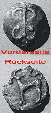 So-called Potin lumps, of which the largest weighs 59.2 kilograms (131 lb), were found at Alpenquai in 1890. They consist of a large number of fused Celtic coins, which are mixed with charcoal remnants. Some of the about 18,000 coins originate from Eastern Gaul, while others are of the Zürich type, that were assigned to the local Helvetii, and date to around 100 BC. The find is so far unique, and the scientific research assumes that the melting down of the lumps was not completed, and therefore the aim was to form cultic offerings. The site of the find was at that time at least 50 metres (164 ft) from the lake shore, and probably 1 metre (3 ft) to 3 metres (10 ft) deep in the water.[5][6]
