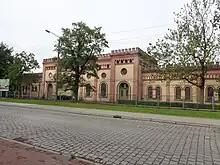 Due to the Nazi regime's legislation restricting the rights of German Jews, including the prohibition of Jewish people from owning businesses, the factory was confiscated from the Fränkel-Pinkus family in 1938 and the family was forced to flee Germany.[1] The company was then renamed Schlesische Feinweberei AG. In late September, 1944, the Nazi regime established a sub-camp of Auschwitz in the factory where about 400 women, mostly Jews from Hungary, were forced to work on the spinning machines. The factory was known as and was directed by SS-Oberscharführer Bernhard Becker with twenty additional members of the SS. The subcamp was shut down on 19 January 1945 and the women there were forced to march by foot to the Gross-Rosen concentration camp.[2] From there they were then taken to the Bergen-Belsen concentration camp; it is unknown who among them survived.[3][4]
