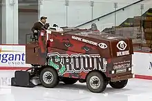 A Zamboni brand ice resurfacer clears the rink at Meehan Auditorium, Brown University.