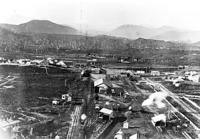It was the terminus of the Strahan–Zeehan Railway from the south, the Emu Bay Railway from the north and a number of narrow gauge tram systems that utilised the railway yard and radiated out in all directions from the station.[1]