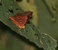 Male upperside is vinaceous (colour of red wine) brown, the veins ochraceous brown. Forewings and hindwings crossed by four series of minute white spots, the postdiscal series very often obscure, each spot bordered inwardly by a more or less elongate black spot; a terminal very slender black line; cilia alternately black and white. Underside is bright ochraceous brown, the veins conspicuously paler, the white black-bordered spots as on the upperside but larger, more clearly defined and prominent. Antennae brown ringed with white; club black, ochraceous at apex; head, thorax and abdomen concolorous with the wings; beneath, the palpi, thorax and abdomen slightly paler than the wings.