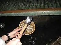 The tradition of washing money at the spring in the hope of seeing it multiply was born in 1257 (Shōka 1) when Kamakura's ruler Hōjō Tokiyori came here to worship and recommended the faithful to wash their coins, saying that if they did so, they certainly would be rewarded by Ugafukujin, who would multiply them and grant their descendants prosperity.[1] He himself did so, and people started imitating him, starting a tradition which continues to this day and is the reason for the shrine's popularity. Its spring came to be called Zeniarai-mizu (銭洗水, money washing water) and during the Edo period was considered one of the Five Famous Springs of Kamakura (鎌倉五名水), noted for the quality of their waters.[note 3]