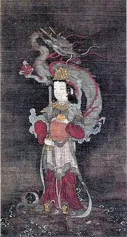 Zennyo Ryūō (善如龍王 or 善女龍王, lit. "goodness-like dragon-king" or "goodness woman dragon-king", respectively) is a rain-god dragon in Japanese mythology. According to Japanese Buddhist tradition, the priest Kūkai made Zennyo Ryūō appear in 824 AD during a famous rainmaking contest at the Kyoto Imperial Palace.