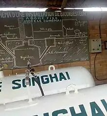 The Songhai zero waste farm in Benin was started by Father Godfrey Nzamujo in 1985. It is now recognised as a centre of excellence by the UN and its philosophy and methods are now studied and followed by thousands in Africa. The picture shows the generation of biofuel from animal waste. This fuel is then used for cooking and generation of electricity.[1]