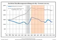 Development of population since 1875 within the current boundaries (Blue line: Population; Dotted line: Comparison to population development of Brandenburg state; Grey background: Time of Nazi rule; Red background: Time of communist rule)