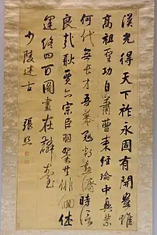 A native of Jiangsu, Zhang obtained a jinshi (successful candidate) position in the imperial examination in 1709 and was employed in literary and examination work, rising in 1733 to be the Secretary of the Ministry of Justice. Two years later, he narrowly escaped execution for his failure to arrange the management of the aboriginal territories in Guizhou. He was again employed on literary work, and was joint compiler of the Lülü Zhengyi (律呂正義) and its sequel Houbian (後編) under the same name, the two standard treatises on music. His poems were much admired by the Yongzheng Emperor, who was especially struck with some verses written with his left hand after a fall from his horse had disabled his right arm. He died of grief for the loss of his father. In his Retrospect (懷舊詩, 1779) the Qianlong Emperor numbered him among his Five Men of Letters (五詞臣), the others being Qian Chenqun, Liang Shicheng, Shen Deqian, and Wang Yudun. He was given the posthumous name Wenmin (文敏).