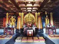 Zhaoshan Temple is built along the up and down of Mount Zhao and divided into the central, east and west routes.[1][2] Zhaoshan Temple faces south with the Four Heavenly Kings Hall, Mahavira Hall, and the Guanyin Hall along the central axis of the complex. On both sides of the central axis are Bell Tower, Drum Tower and ring-rooms.[1][2]