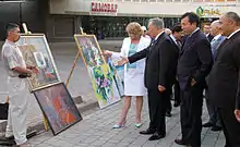 Zhenis Nurlybayev shows his paintings to Nursultan Nazarbaev
