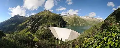 The Zillergründl Dam is an arch dam on the Ziller River in the upper Ziller Valley of Tyrol state, Austria. It is 16 km (10 mi) east of Mayrhofen. The primary purpose of the dam is hydroelectric power production and it supports a 360 MW pumped-storage power station. As part of the Zemm-Ziller Development, construction on the dam began in 1981 and it along with the Häusling Pumped Storage Power Plant were complete in 1986. The power plant was fully commissioned by 1988. The dam is the second tallest in Austria.[3]