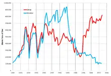 In 2019, 552,400 tonnes of zinc, 71 percent of US mined zinc production, and 4.2 percent of world zinc production, came from Teck Resources' Red Dog mine, the world's most productive zinc mine, in northwest Alaska, near Kotzebue.[2][3][1] The mine opened in 1989.[4] The zinc is shipped as concentrate to foreign smelters. The Red Dog is a polymetallic deposit, which also produces lead and silver concentrates.[5]