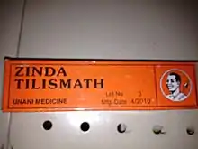 Zinda Tilismath is a Unani herbal medicine used for treating many common ailments like cold, coughs, throat pain, body pain, stomach disorders, ear pain, tooth pain and many more products. Based on the ancient herbal unani concept of medicine, Zinda Tilismath was founded by Hakeem Mohammed Moizuddin Farooqi in the year 1920. This was the period when new industries were beginning to emerge on the surface of Hyderabad and adding to Deccan's grandeur. [1] It is an over the counter drug, which is made from selected herbs. The medicine is said to have no side effects due to its herbal composition and is based on the Unani concept of medicine. It's available across India in many medical and general shops.[2]
