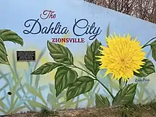 In the 1920s, the town was known as "The Dahlia City" due to the success of two nurseries in the area in growing the flower. Starting in 2019, the Zionsville Cultural District brought the name back to promote the city, in conjunction with giving away free flowers to grow and the painting of a mural.[11]