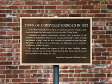 Zionsville was laid out in 1852 when the railroad was extended to that point.[7] It was named for William Zion, a pioneer settler.[8]