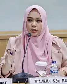 Zita Anjani (born 12 March 1990) is an Indonesian activist, teacher and politician who became the Vice Chairman of Jakarta Regional People's Representative Council (DPRD DKI) since 2019.[1][2] Since she is the only woman holding the a high position at the DPRD DKI, her name has become quite popular.[3] She also actively participates in politics, social issues, and education.[4]