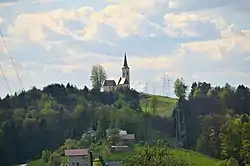 The local church, built on a hill east of the settlement, is dedicated to Saint Rosalia and belongs to the Parish of Šentjur. It dates to the 17th century, with a chapel dedicated to Saint Anthony added to the southern nave in 1746.[8] The church was built as a votive offering in the aftermath of the plague of 1645–1660; it is distinguished by its high-quality architecture and stonework. The main altar dates from 1667, and the three altars in the nave from 1859. The chancel was painted in 1908 by the Celje painter Albin Paradiž (?–1910). The glass chandelier dates to 1850. The largest of the church's bells was cast in Celje in 1756 by Gašper Schneider (1726–1774); its tone was considered so strikingly gentle that the composer Gustav Ipavec composed the song "Iz stolpa se mi zvon doni" (From The Tower The Bell Tolls To Me) in its honor. Saint Anthony's chapel contains frescoes by the Ljubljana painter Franc Jelovšek (1700–1764), an altar dating from 1864 to 1866 by the Celje wood-carver Ignacij Oblak (1834–1916), and a pulpit from 1870.[9]