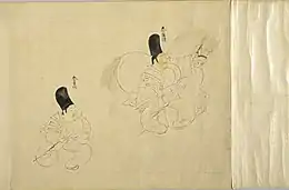 The rendering of the nine portraits is based mainly on thin black lines drawn in India ink, the colour being limited to discreet touches for the faces and harnesses of the horses.[5][6][7][8] The pictorial technique is therefore linked to the hakubyō tradition popular during the Kamakura period: monochrome drawing in ink on plain paper.[6]