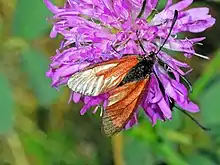 These rather small diurnal moths develop a complete metamorphosis which involves a pupal stage (holometabolous). Adults are on the wing between June and August.[4][6] They visit flowers of Centranthus (Valerians). [7] The larvae feed mainly on Eryngium campestre and Eryngium amethystinum.[8][4][1]