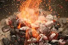 - (intransitive) to burn, to be on fire (to be consumed by fire, or in flames)