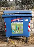 - Synonyms: σκουπιδοτενεκές (skoupidotenekés), δοχείο απορριμμάτων (docheío aporrimmáton)