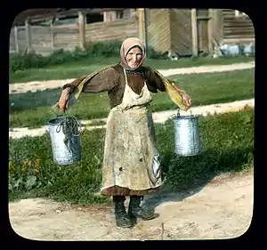 An old woman carrying a shoulder yoke.