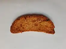 - (inanimate, countable) rusk (a piece or slice of bread, dried or toasted until hard and crisp)
