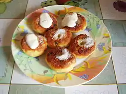 сы́рник • (sýrnik) m inan (genitive сы́рника, nominative plural сы́рники, genitive plural сы́рников, relational adjective сы́рниковый, diminutive сы́рничек)
