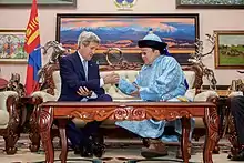 American secretary John Kerry and the Mongolian president Tsakhia Elbegdorj exchanging snuff